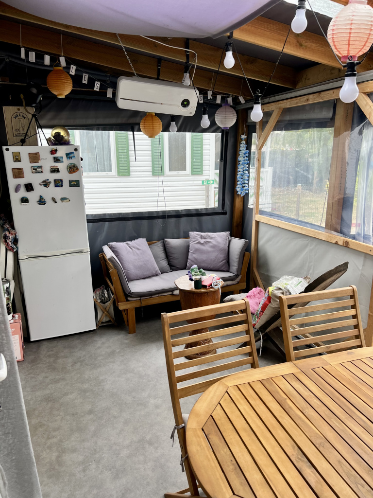 Mobil-home avec 2 chambres (un lit double et deux lits simples), coin salle à manger, salon, cuisine séparée avec ouverture sur la terrasse, toilettes et salle de douche.