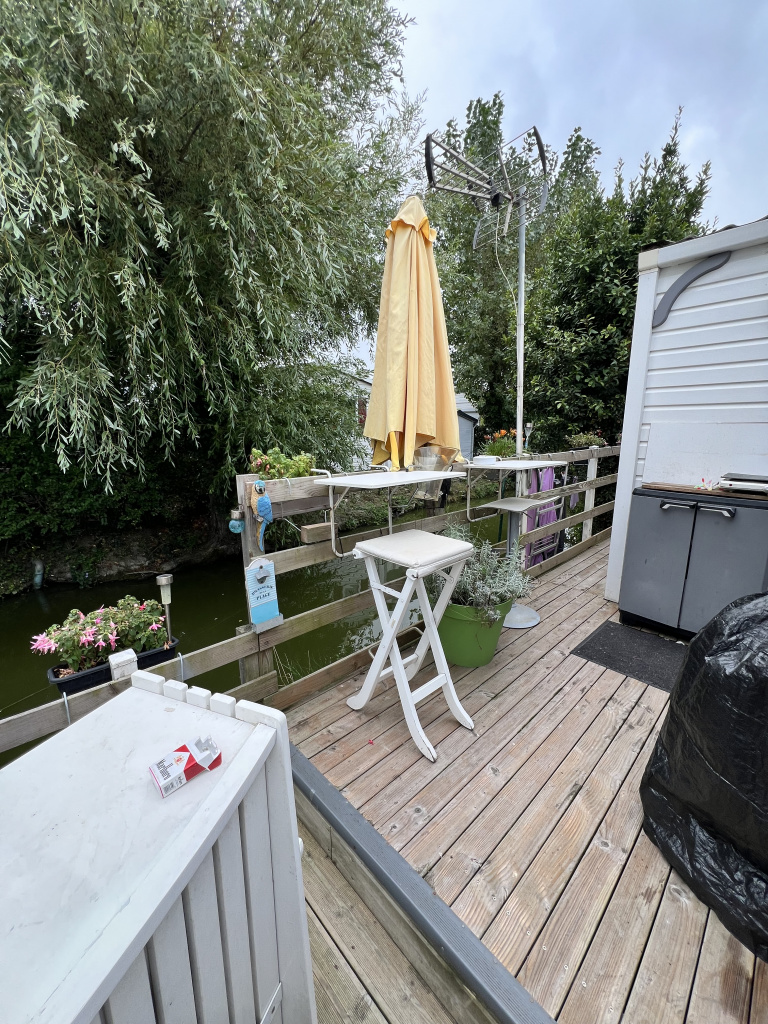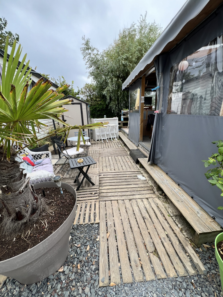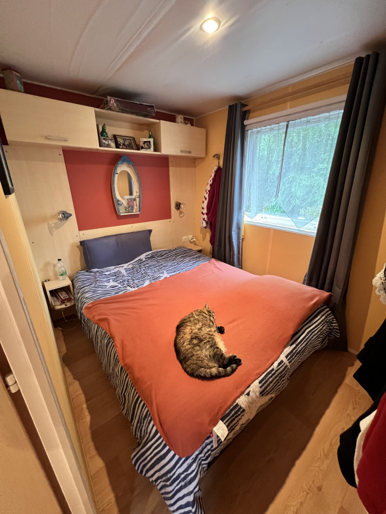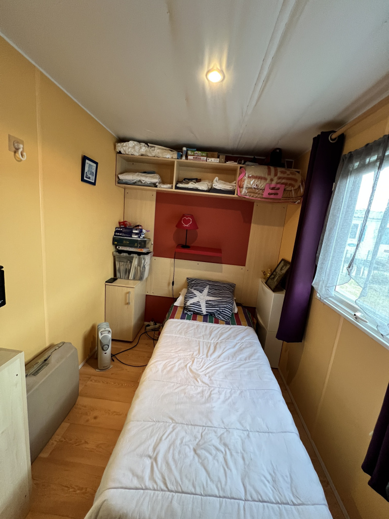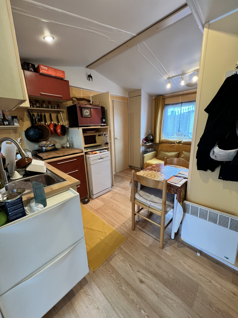 Mobil-home Rapidhome neuf, type résidentiel 2022, deux chambres, une chambre avec un lit double, une chambre avec deux lits simples et une banquette convertible dans le salon. Salle de douche et toilettes séparés. Terrasse bois couverte de 11m2.